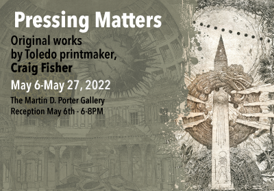 “Pressing Matters”, an exhibition of etchings and other works on paper by Craig V Fisher are on display at the Martin D. Porter gallery a the Toledo School for the Arts in Toledo, Ohio. The exhibition will be view till May 27, 2022. Gallery Hours are Monday through Friday, 8:00 AM – 3:00 ( or during school hours by appointment. (Visitors can part at 14th St. or in the school parking lot on 14th and Madison)