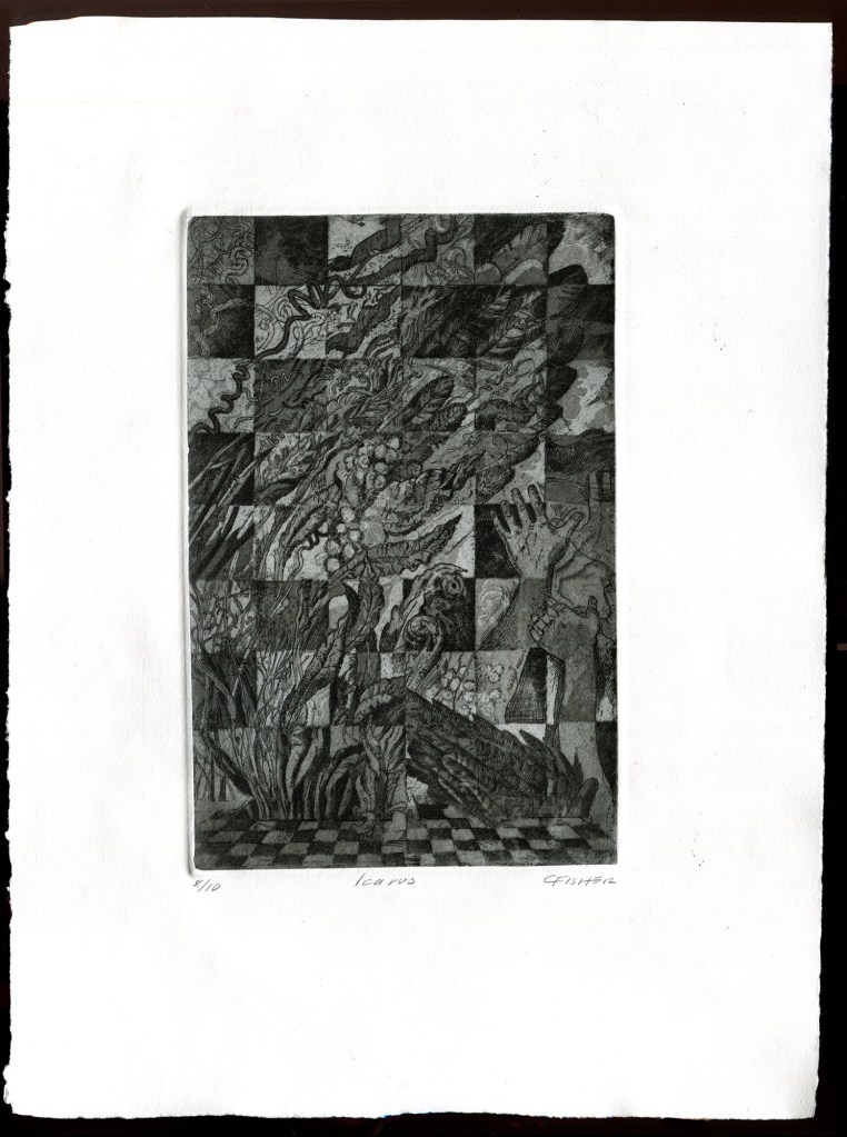 Icarus • aquatint etching chine collé• 6″ x 9″• Edition of 10 • 2023