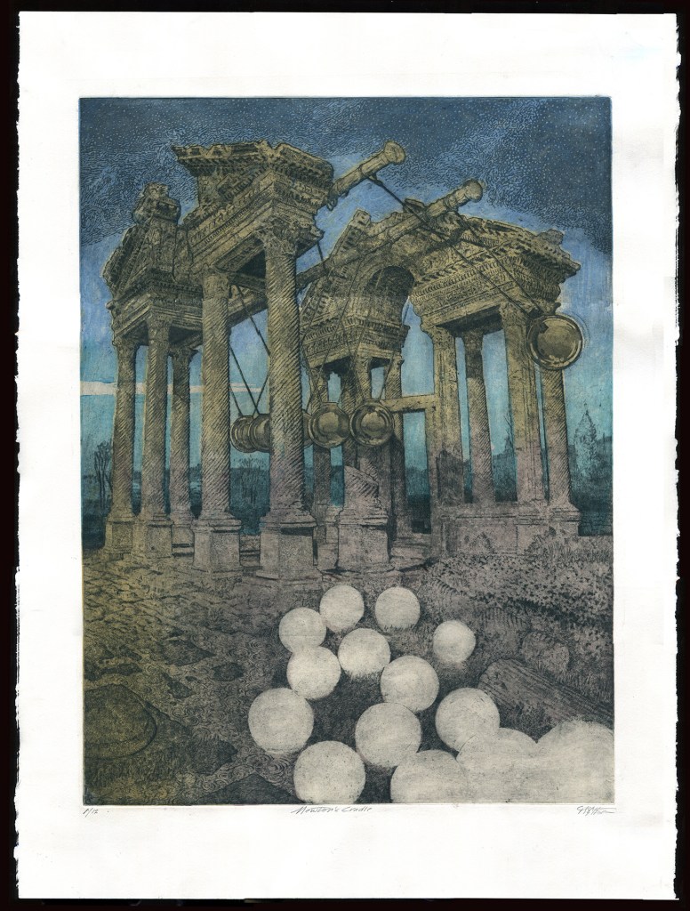 Newton’s Cradle • aquatint etching• 24″ x 36″ with Japanese woodblock, chine collé• Edition of 12 • 2024