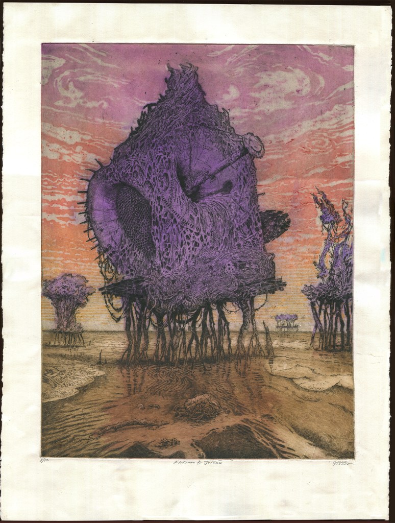 Flotsam and Jetsam • aquatint etching• 24″ x 36″ with Japanese woodblock, chine collé• Edition of 12 • 2024